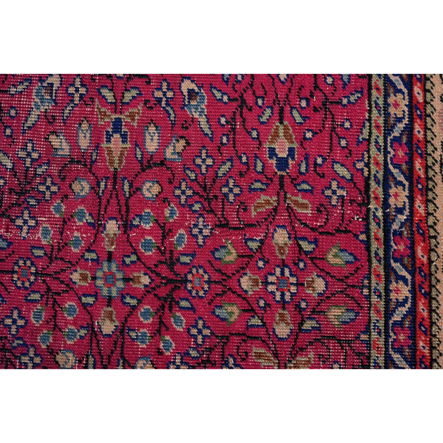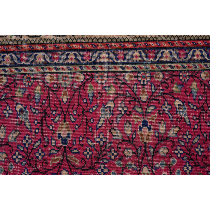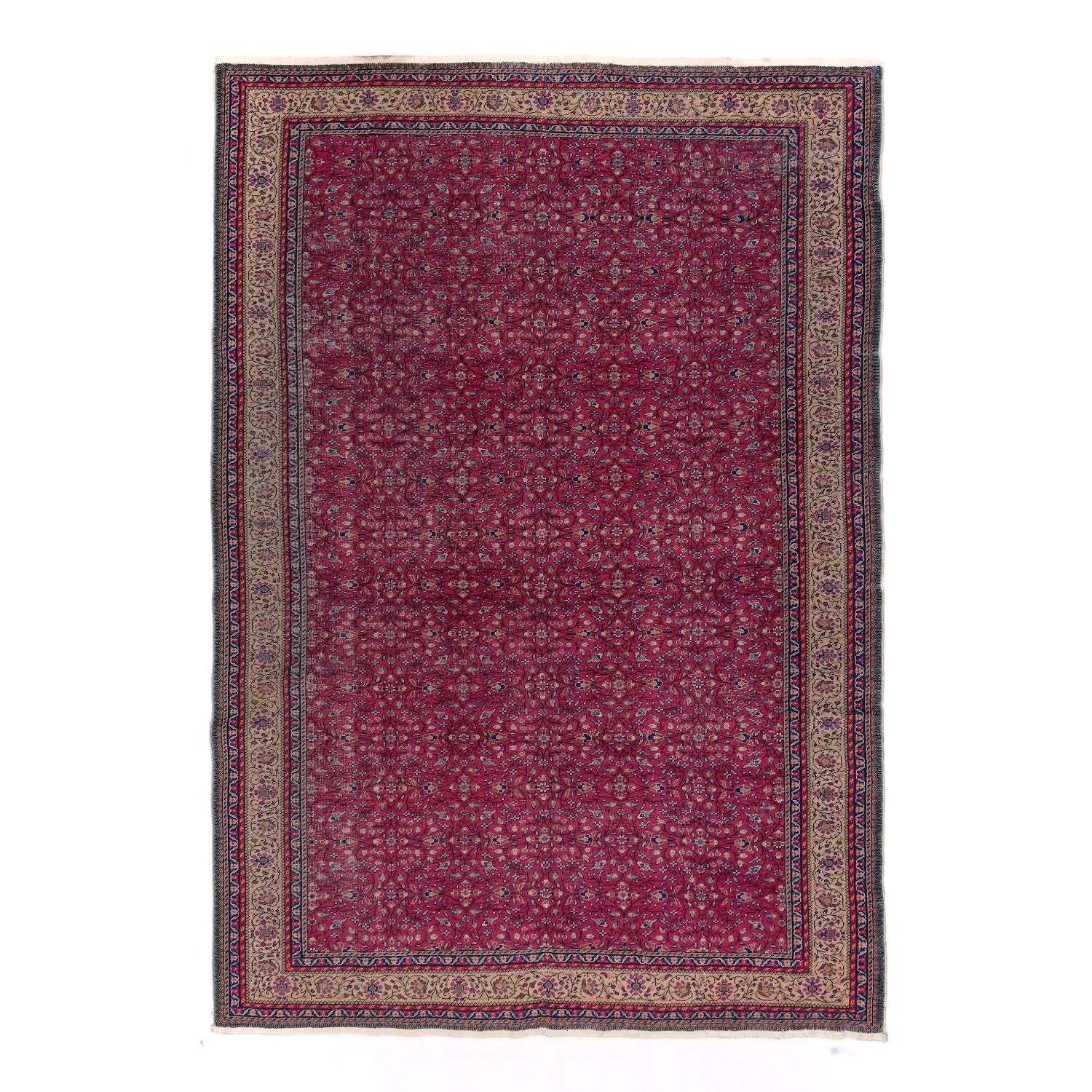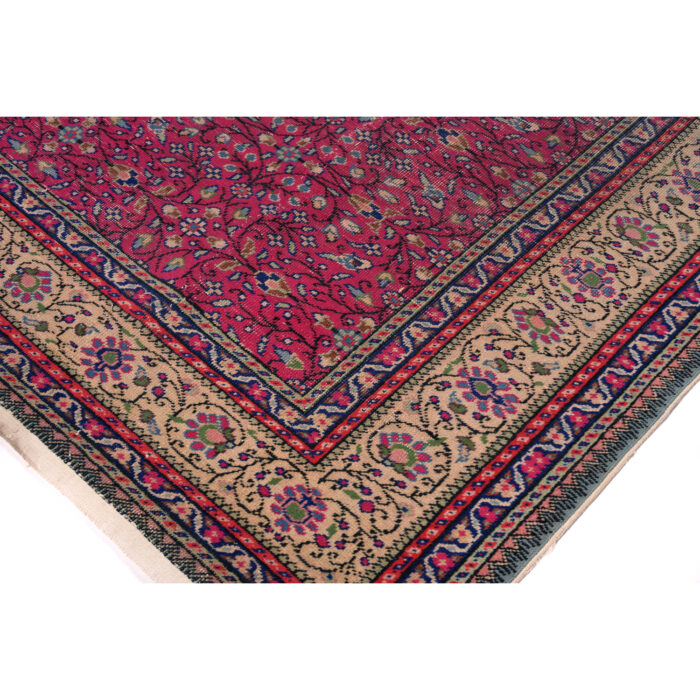 Questo grande esemplare dal vello consumato e basso è caratterizzato da motivi floreali senza medaglione centrale.