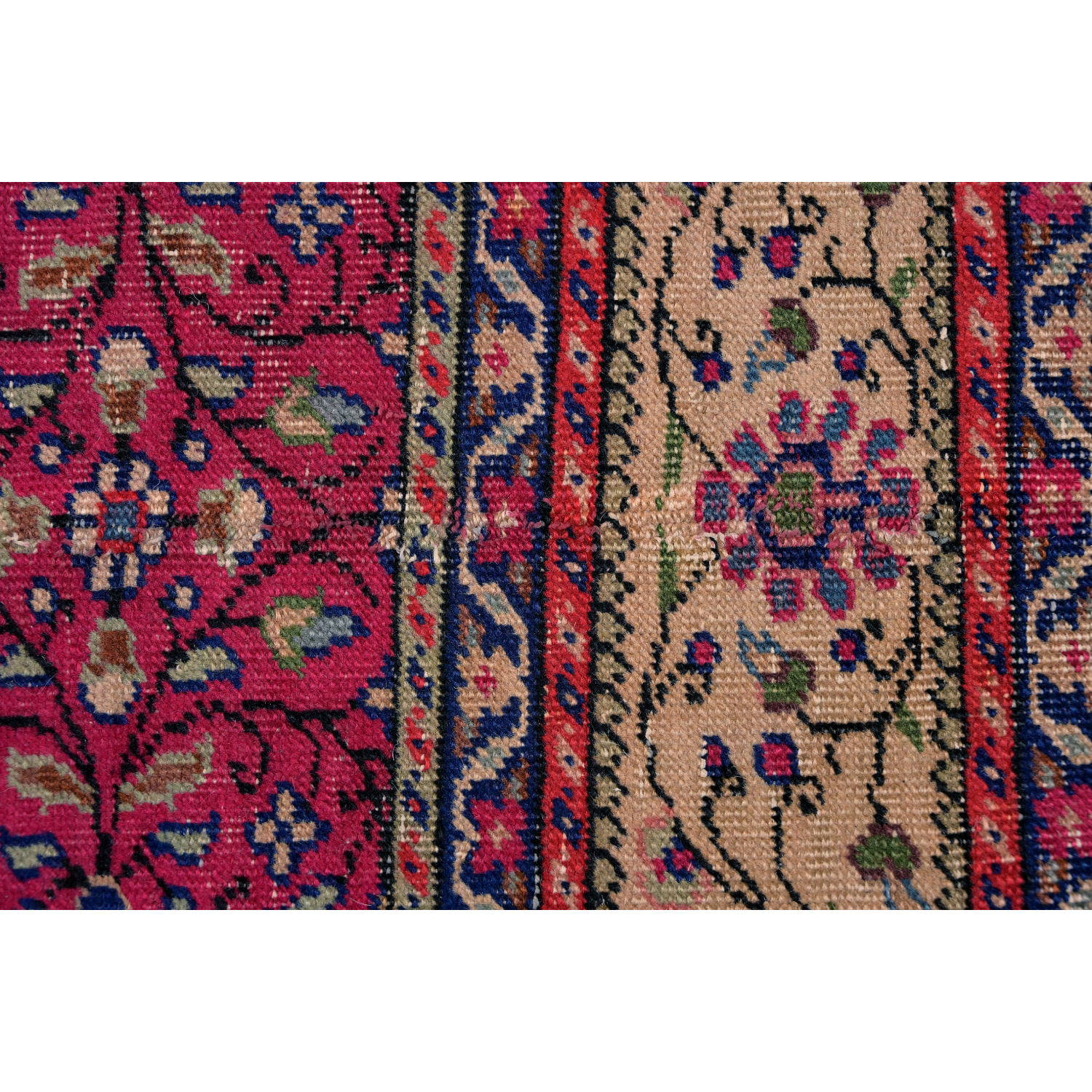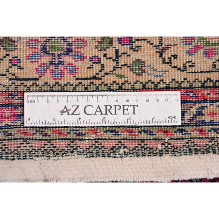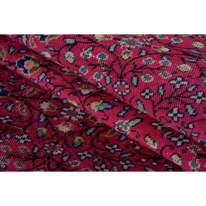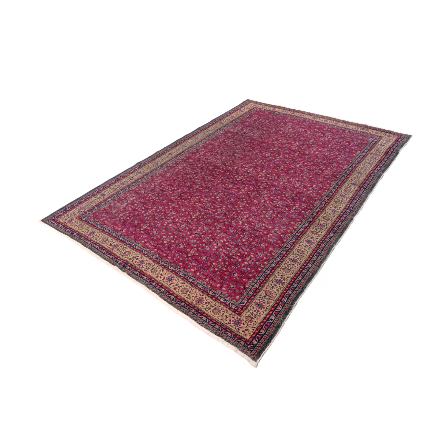 Questo grande esemplare dal vello consumato e basso è caratterizzato da motivi floreali senza medaglione centrale.